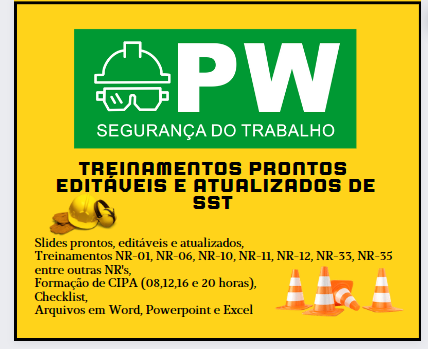 Com os Treinamentos Editáveis de Segurança do Trabalho, adquira slides prontos e editáveis para Formação de CIPA, treinamentos das NR's, checklist, DDS, vídeos de segurança, direção defensiva, APR, arquivos em Word, PowerPoint e Excel. Economize horas de trabalho e conquiste 100% de aproveitamento com conteúdos atualizados e prontos para uso imediato.